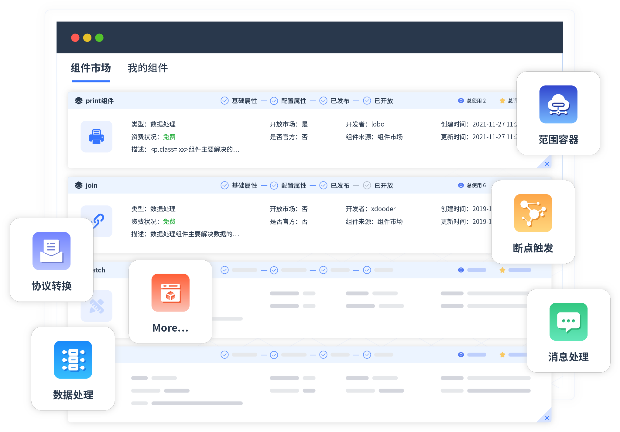 针对集成场景,b体育提供组件市场,例如协议转换、消息处理、文件操作等。除平台提供的组件外,客户可以自定义所需组件。